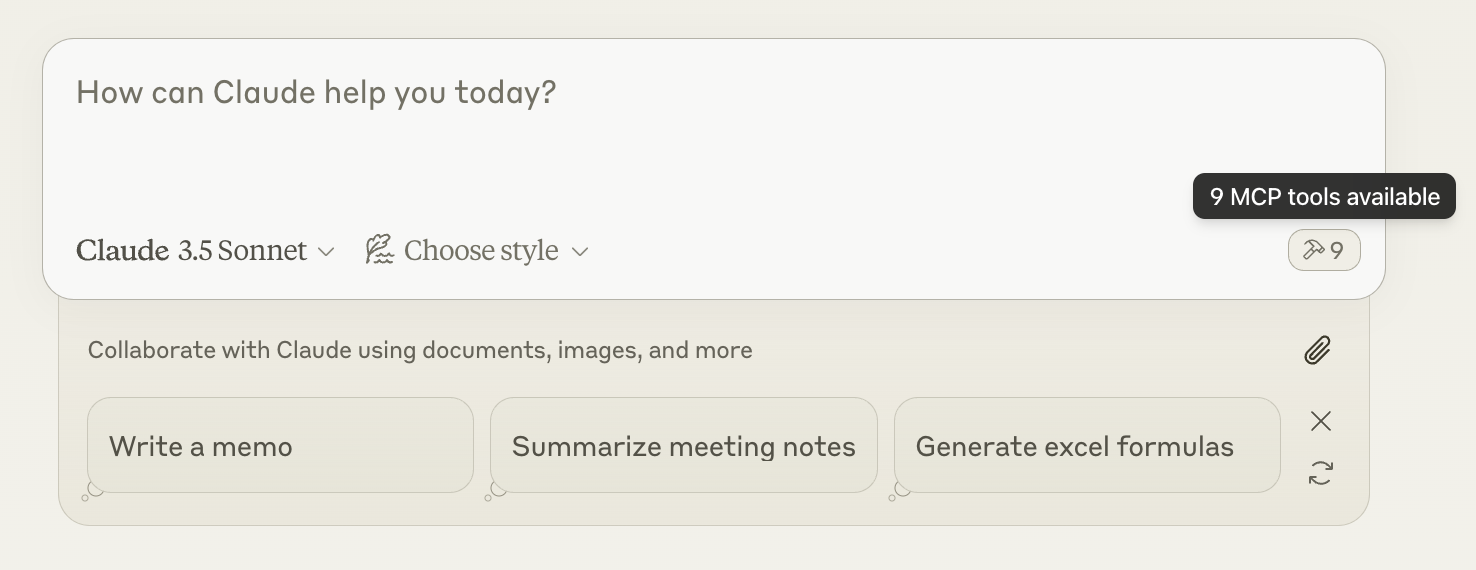 更新配置文件后,您需要重新启动 Claude 桌面版。 重新启动后,您应该在输入框的右下角看到一个锤子